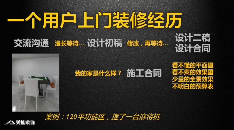 传统模式装修的各个环节,比如设计、预算、材料、软装等都是割裂分开的,导致信息错位、管理混乱、耗时费力,而美迪全房全景模式本质上是通过设计将装修全程集中管理,设计是基于业主的真实需求、预算和材料等,更可控,消费更透明。